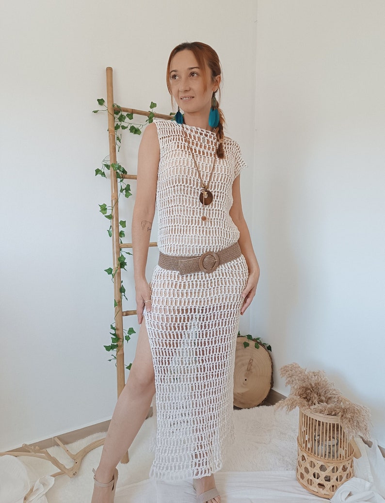 This crochet dress for women is undoubtedly a unique piece, not only because of its versatility when wearing it, but also because it is made with recycled cotton yarn.