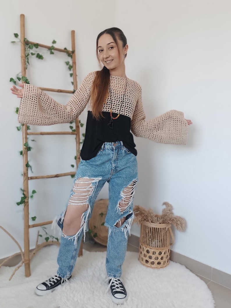 Cropped crochet sweater with bell sleeves, made with a yarn composed of 50% cotton and 50% merino wool.