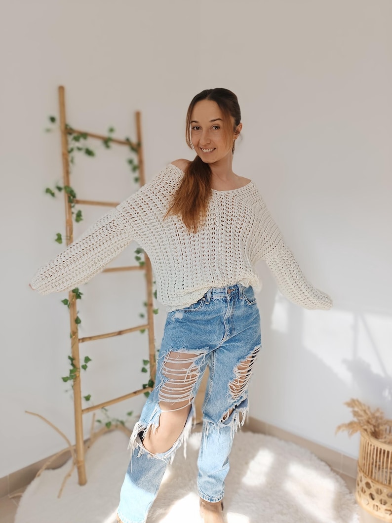 This sweater using a thick cream yarn and a large hook, so the fabric is loose and airy perfect to wear any time of the year.