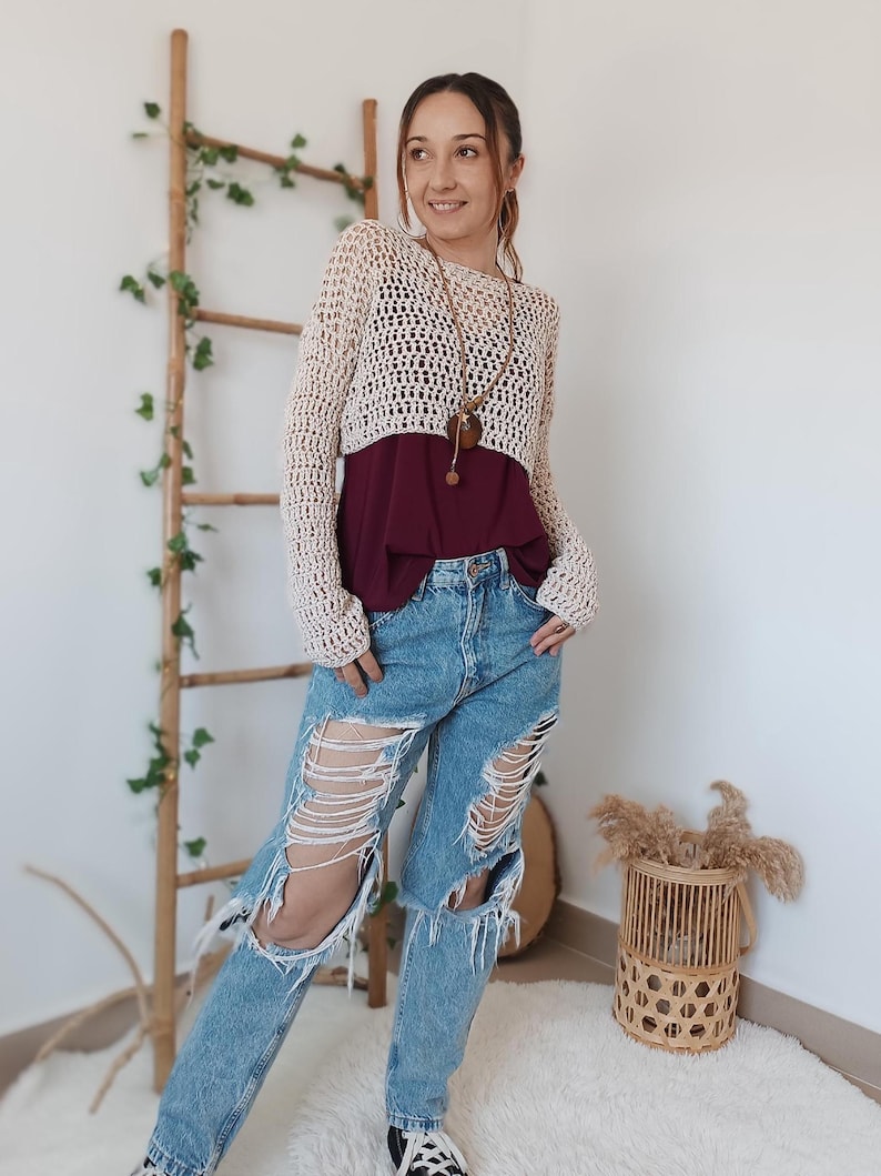 This short, long-sleeved sweater using a recycled cotton yarn in an off white color, making it perfect for the spring-summer season and very easy to pair with any color.