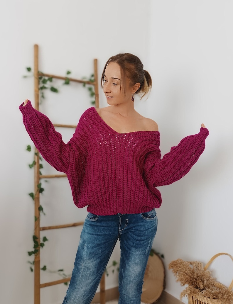 It's a crocheted jumper with a V-neck and back, woven in premium acrylic wool super soft and hypoallergenic.