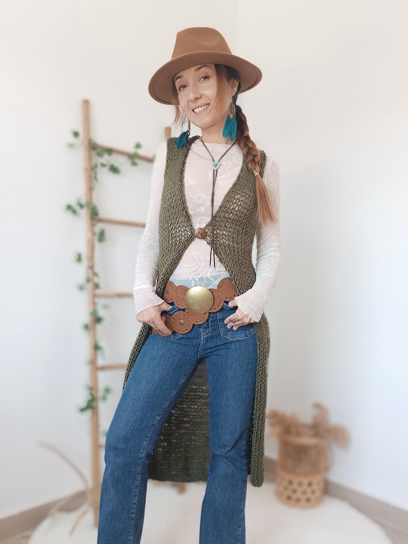 Moss Green Knit Long Vest With Button, Sleeveless Long Cardigan Women, Boho Long Vest, Openwork Long Vest