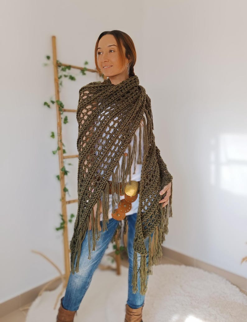 You can wear this rustic/boho style shawl, which is trending this spring and summer, with jeans to add a stylish touch to your outfit or with a dress for a formal event. Either way, it will become one of your favorite accessories.