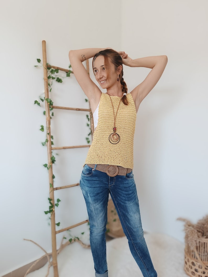 Add a touch of style and sustainability to your wardrobe with this beautiful hand-knitted tank top. Perfect for warm summer days, this unique top is made with 100% recycled yarn in a mustard yellow color.