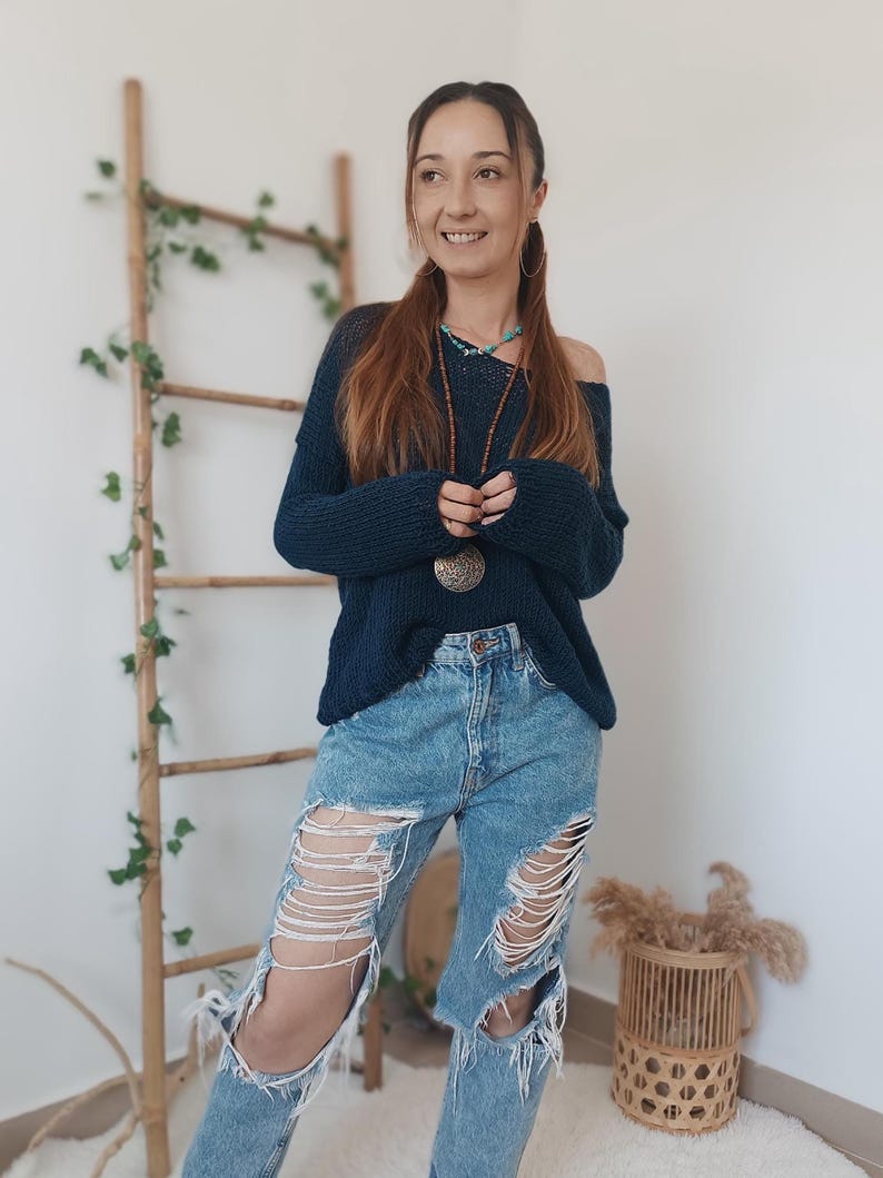 It’s a loose fitting sweater with sleeves that fall right at the wrist and offers great comfort. It’s perfect to pair with wide-leg jeans for a relaxed look, or as a cozy complement to a flared skirt or even joggers for lounging comfortably at home.