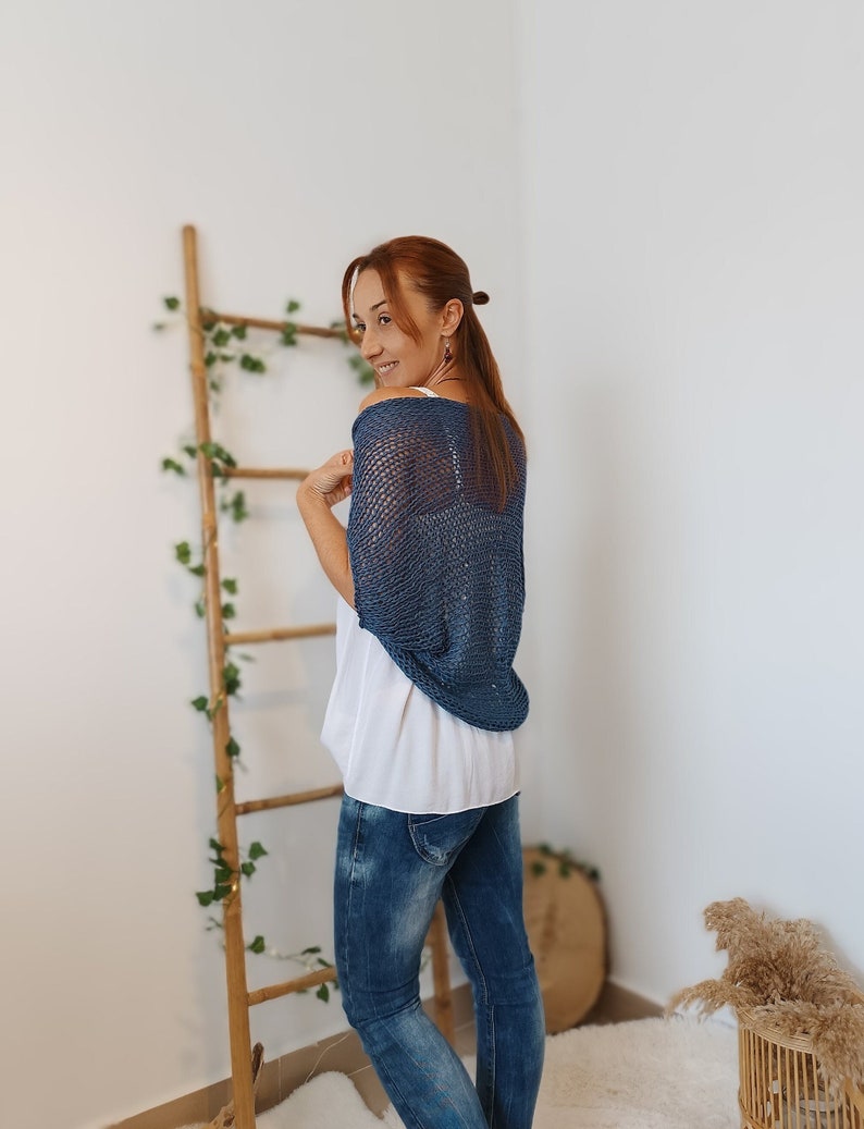 Discover elegance and comfort with this short bolero shrug, meticulously hand-knitted in a charming petroleum blue color. This versatile accessory is the perfect complement to any outfit, adding a touch of sophistication and style.