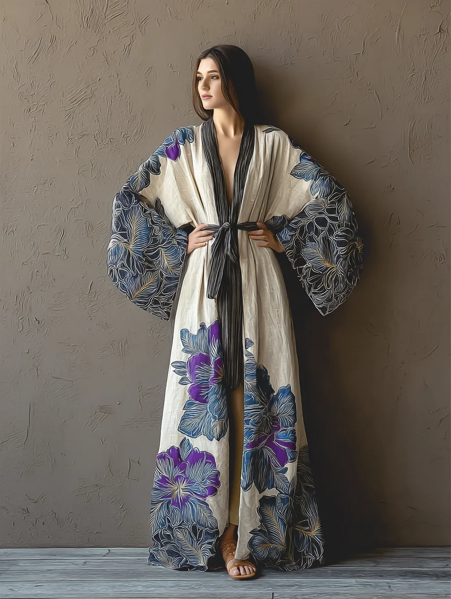 Women's Purple Peony Kimono Linen Robe (Including Belt)